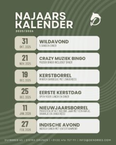 De najaarskalender van D’n Dries staat weer bomvol leuke en gezellige evenementen! Van Indische avond tot Crazy muziekbingo, er is voor ieder wat wils. Zet deze data dus snel in je agenda en zorg dat je erbij bent. 🎉